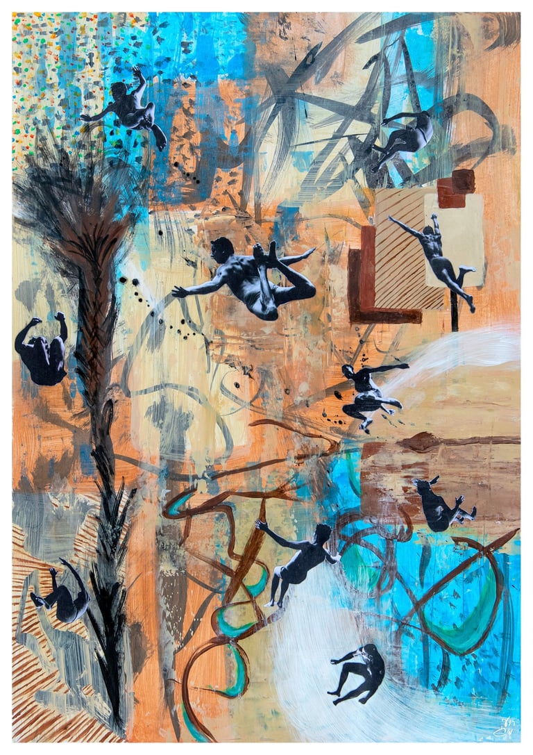 “Jump”, 2024 mixed-media collage on paper (50x35cm)